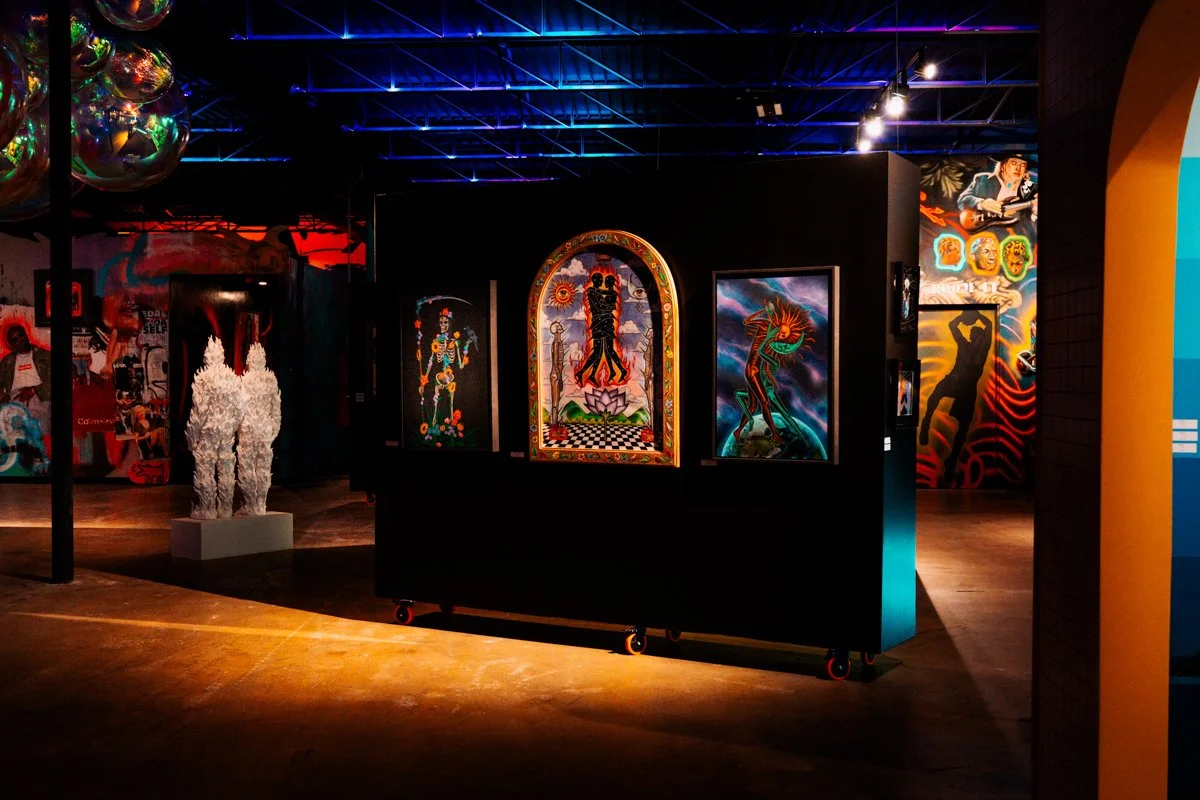 Tucked into a 16,000-square-foot historic building in West Dallas, Gallery DeFi isn’t about standing politely and staring at paintings. In fact, to us it wasn’t your typical gallery at all. It’s a total fever dream. A place where murals bleed music, fashion walks like sculpture, and art becomes a full-body experience. Gallery DeFi wants you to feel. To interact. To question everything you think you know about art. We’ve been to exhibits all over the world, but this one hit us differently. Harder. Louder. Stranger. It’s not a space you walk through. It’s one that moves through you.
